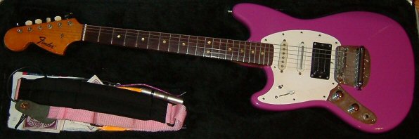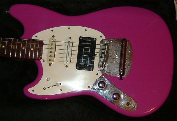 It's a lefty '68 Fender Mustang. I've altered it greatly as you can tell, but I've had several guitars, but none has had the versatility and sound that this little guitar has. I bought it for $75 22 years ago... ouch.... That one hurt.