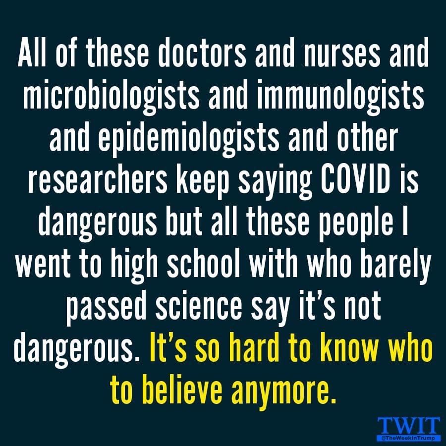 Alan B wrote: Here's a tip: There is so much misinformation, lies, and conspiracy theories circulating on line. Anything you read on any of the social media platforms, such as Facebook, is 99% false. It's not a very good place to get your information from. So, don't trust or believe anything from these type of platforms. but....but....but.....this chiropractor online said all the scientists, doctors, and virologists are wrong... Attachment: