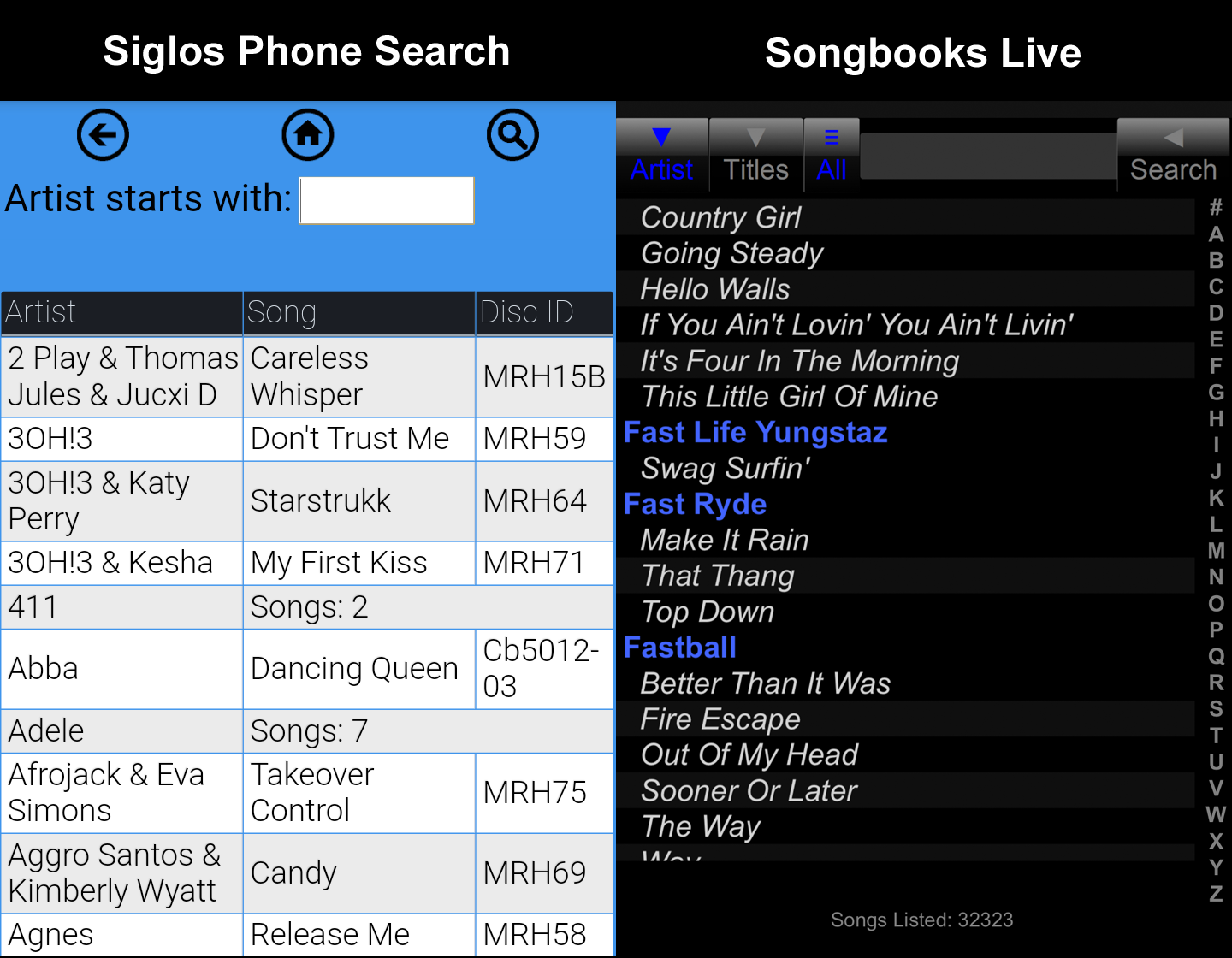 Now that your cost argument has been proven a lie, let's move on to what a joke your app is. Please refer to the image above. I took the screen shot right from siglos web site. If it's improved since, let me know. 1. The obvious white background was not thought out by someone who's actually been to a karaoke show. Darker backgrounds are easier to read in dark environments like bars. 2. Siglos only allows searches by the "starts with" text. What if you only know some of the words in the middle? or can't spell the first word? 3. Songbooks Live has an index bar on the right side. Very convenient. Especially when viewing the entire book. Can Siglos view the entire book at once? ...and quickly flip to any letter without typing in the search box? Doesn't look like it. 4. Lot of wasted screen space in the Siglos app since they repeat the artist name each line. The oversized font is also causing a lot of line wrapping, which also is a waste of screen space and makes it difficult to read. I could go on. I could also put Karma's screen next to Siglos and have a field day, but at some point, I'm just rubbing it in. Stop lying about costs Danny. Stop lying about a lot of things. I'll call you out each and every time. There's a reason your favorite Polish software developer doesn't show up here and defend himself. He's sneaky in his sales tactics. His UI designs are crap, and he clearly isn't a karaoke singer. Also, the only people even attempting to defend his work are people like you who have to lie to make an argument. Having an opinion is one thing. Lying is another.