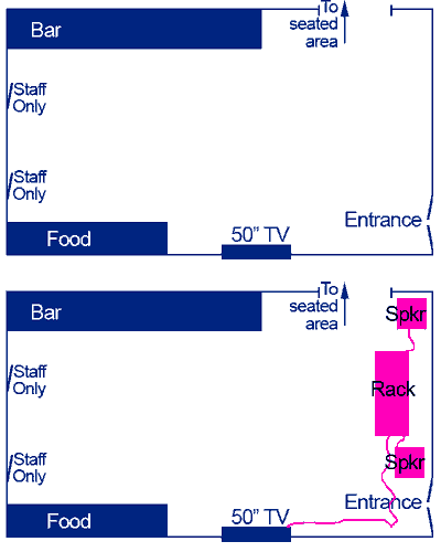 Nlouch @ Fri May 23, 2008 10:47 am wrote: OK the seated area is for all intents and purposes a separate room. People will be dancing I guess in the room shown. It's a crap room in my opinion, but when needs must. Also, it's an echo magnet  Feedback is gonna cause a real issue here! But yeah, you say put the speaker near the screen, almost facing the other speaker? Maybe not directly facing, you want them a little off line from each other.