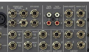 There are left balanced XLR outputs on the back of the VocoPro receiver (female) and right and left ¼" inputs and outputs on the MX. The mixer channels have both ¼" and XLR inputs, plus a ¼" INSERT jack.