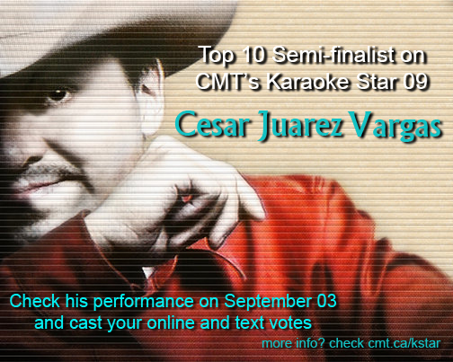 I would like to share with you great news! I am part of the Top10 semi-finalists for Karaoke Star 09 (a show from CMT, Country Music Television). Show will be aired on Sep 03 and then you'll have a chance to vote online or text as many times as you want. Keep tuned and I will send scheduling info.