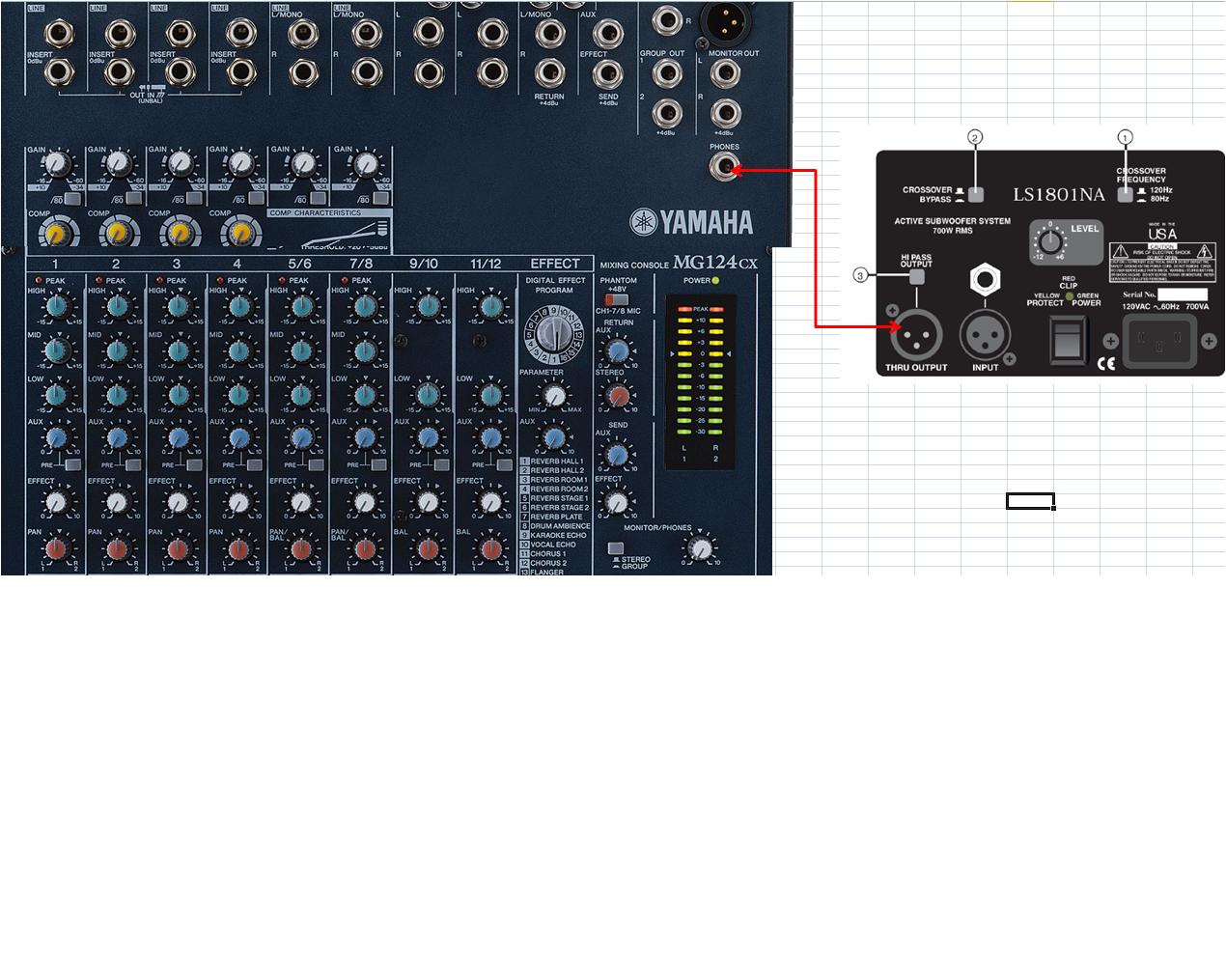 I am assuming you meant for the red arrow to be pointing to the input, not the Thru (output). Are you then sending a full full range signal to your tops or are you using a seperate crossover? |