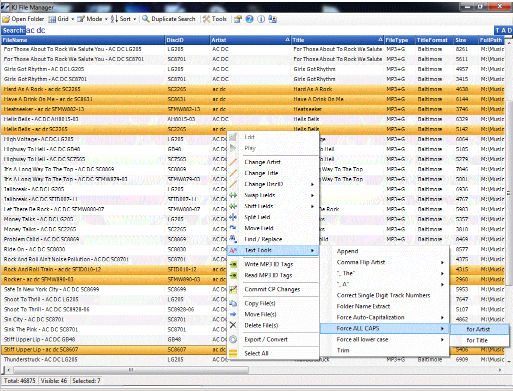 Latshaw's KJ File Manager. Will change disc ID, or Artist or Song name.. it will switch the artist/song or artist/disc ID, or song/disc ID. It will do batches.. if you highlight which songs you want to switch. It will change the artist from 'Toby Keith' to 'Keith, Toby' also and yes, will do whichever ones you have highlighted (a batch). Right click gives you a list of tools...
