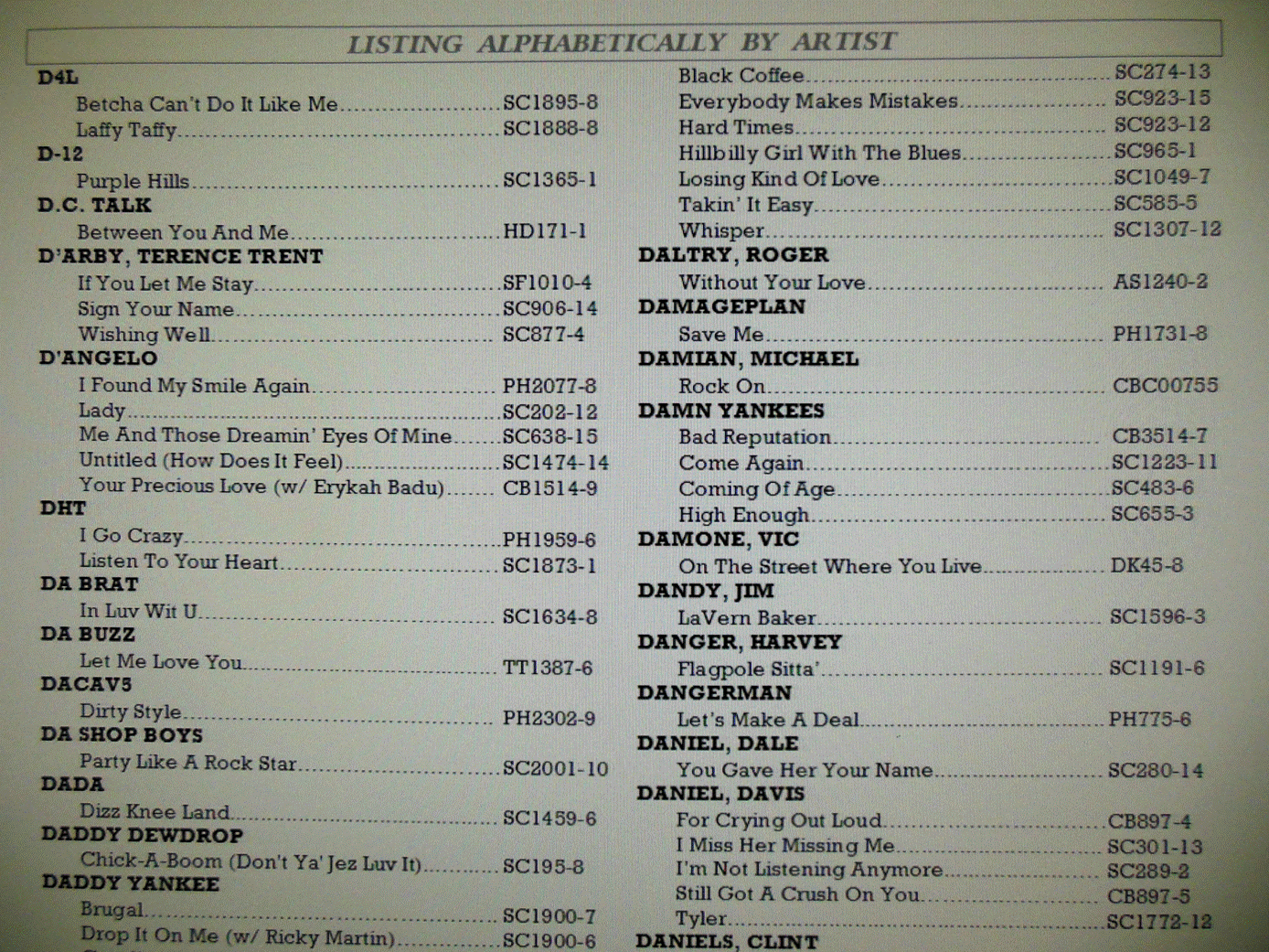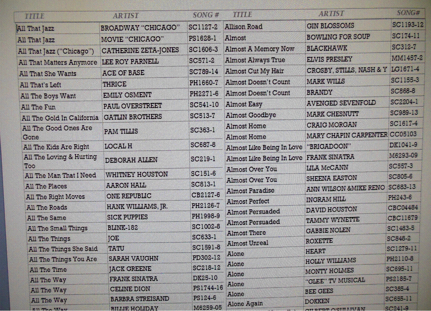 Our files are listed like this: AH2001-01 - Van Halen - You Really Got Me (that would be All Hits disc 2001 with song one) BS9117-11 - Joel, Billy - Longest Time, The (that would be Backstage disc 9117 with song 11)