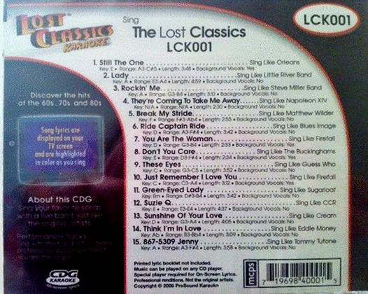 [quote="Brian A"]I agree with Lon. $30 each is overpriced for mediocre cds. Heck, I believe I only paid $18 ea new from way way back years ago.  Try this one - if you win this set 1-9 (sealed/new according to the seller) cost to you would only be $30 w/ shipping. Even if you pay over $50, still better than the lady offering you 8cds @$30 ea = $240. Good luck! http://www.ebay.com/itm/Lost-Classics-K ... 3a8543fbf8[/quote] Those are definitely not the original CD's. I have a couple of the originals, and the cover looked nothing like that, plus the letters were LC, not LCK, so I don't know what those are. I'd be afraid to buy them, not knowing the quality, at whatever price. I'm sorry y'all feel so badly about this series. I used to sing from them at shows, and I liked a few of them a lot. They had Linda Ronstadt's "Ooh, Baby Baby" and it was a great version.