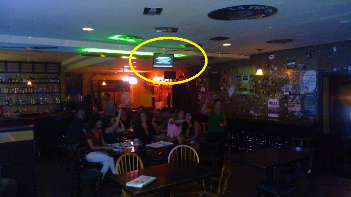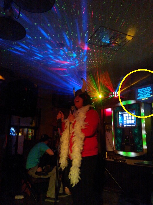 And here, you can see the lyrics screen I mounted from the ceiling about mid-bar. Attachment: