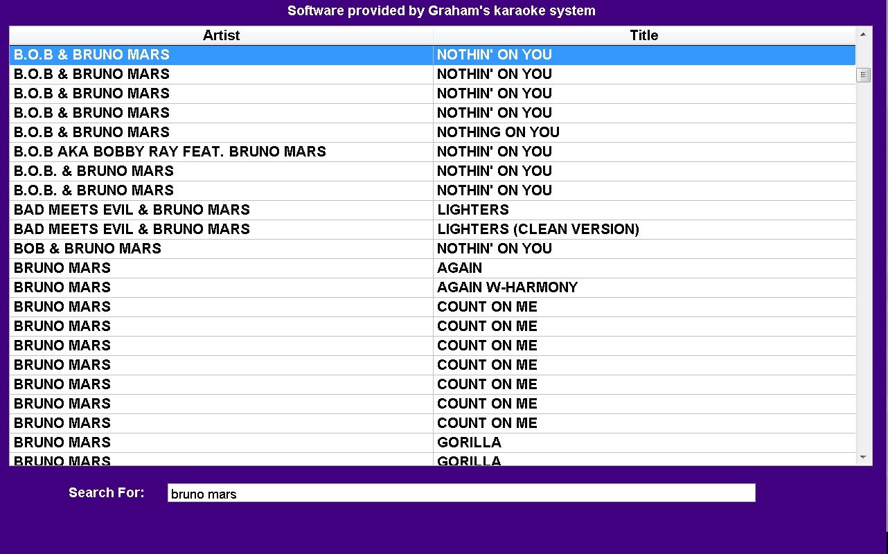 Now this is something I can agree on. Graham’s Karaoke. ‘love it!! ‘been using it for years. I have a laptop set-up on top of my 6 book cabinet. Easy song search, less than a minute to load or update tracks from your drive. Interactive typing. Type two or three letters of the song or artist & it will start searching showing the result as you go along for those letters typed without pressing ‘enter’. Type 3 or 4 letters i.e., BUBL it will show all Michael Buble’s song. Internet connect not needed. btw, I also subscribe to songbookslive.com but that needs internet connection. Problem was they also login to check their inboxes or ‘facebooking’. I just put up a sign above that sez my songbook is also available from their phones 24/7. I bought the graham’s karaoke kiosk one time payment of $19.95, no expiration date. Not interested in their karaoke kiosk & dj complete package $99.95. Great customer support! http://grahamskaraokesystem.com/products.htmlAttachment: