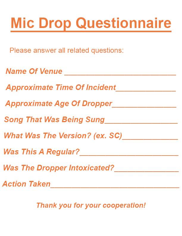 After all these years of hosting, I finally had my first intentional "mic drop". It came totally out of the blue, too. I wasn't expecting him to do anything. But it did get him a swift and permanent ban. We sent him packing, and he was gone in less than 10 seconds. He was very lucky that there was no damage to the mic, or else he would have been spending about $330 on top of no longer being allowed at karaoke.