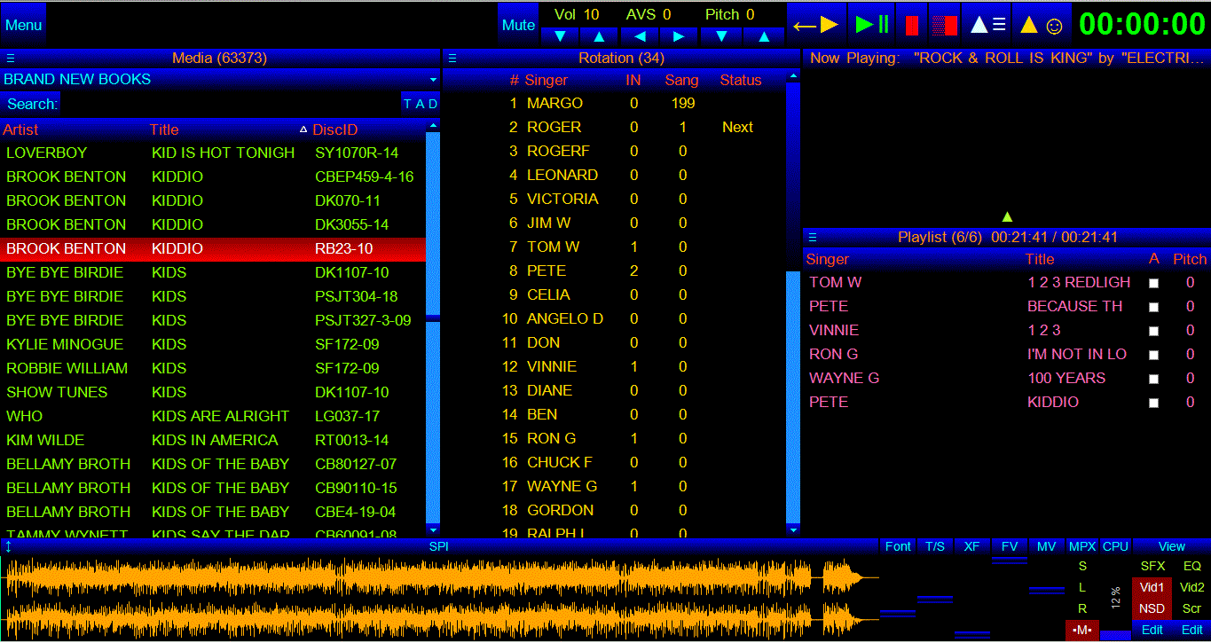 I have been out of the business for several years now, and decided to go a different way than a real computer, and having to deal with a program that could crash on you and then no show. I have almost 19,000 songs on CDG's and put them all on a hard drive player. The real work is taking each track and down loading it on to the hard drive and assigning a number to the track. This takes weeks to do, once you have made up books, see I'm dating my self, all a person has to do is write their name and the track number you are in business. The hard dive on the player has never crashed and just in case, I have a back up. It really isn't an issue, since I'm no longer in the business.