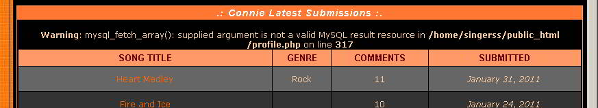 (Warning: mysql_fetch_array(): supplied argument is not a valid MySQL result resource in/home/singerss/public_html/profile.php on line 317)