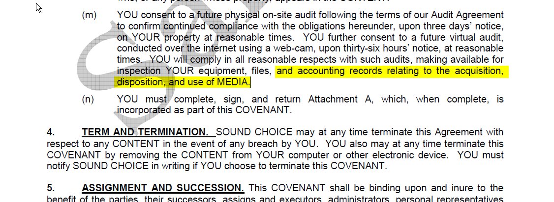Chris are you sure that's the CNS you signed or is that the instructions oh how to prepare for your audit? The most recent CNS I've been able to locate contains the verbiage Harrington referred to. It appears to be dated 3-28-12 http://www.soundchoicestore.com/skin1/images/3-28-12%20COVENANT%20NOT%20TO%20SUE%20~~%20with%20watermark%20~~.pdfMy information does in fact come from the Pre-Suit Audit agreement which I mistakenly referred to as my CNS. However, in comparing my actual CNS forms to the one you linked (and there are some slight differences btw), there is ZERO mention of providing financial information to Sound Choice, in either my version of the CNS or the one you linked to. Voluntary audits do not require you to show anything more than a proof of purchase. -Chris