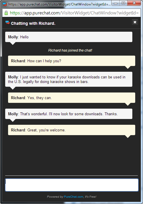 Oh and for what it's worth to you, Tricerasoft's downloads are, I repeat ARE legal for use to put on shows in the U.S. Have a nice day. Sure would like to see a link to ANY licensing documentation for that usage. Hell, I'd like it even better if I could see it for my factory original discs....  That's the whole problem. I may have LIMITED my liability by being OMD, but no host is completely free and clear..... Anything is possible with the awakened giants..... Before I posted my comments earlier, I was at Tricerasoft's website. Using a fictitious name, I clicked on "Speak to a live agent". Here is a snip-it of the very simple transcript that took place.