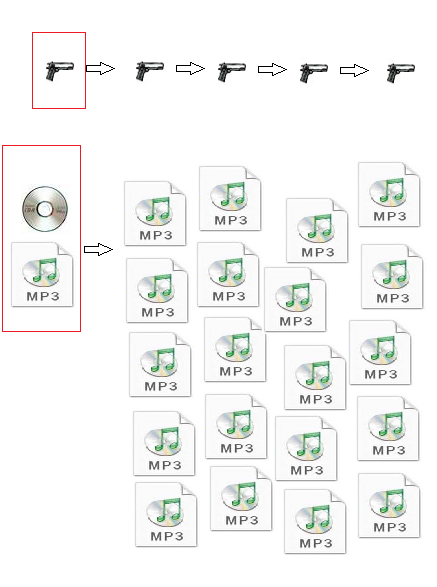 Maybe this illustration will help. When that gun is produced, it is unique. There is only one of that gun. It is sold by the manufacturer to someone and each time it changes hands the person before no longer has it. The person buying it doesn't have any way of keeping a copy of the gun or making more copies to give away or sell. If someone else wants that gun they have to go to the OEM to get it. When a karaoke disc or digital file is produced, it too is unique. There is only one of that file. It is sold by the manufacturer to someone. But technology allows us to reproduce an identical version of that object. When people do this and then give away or sell that object, it robs the OEM of income. In other words - If 1000 people want that gun, then 1000 sales are attributed back to the OEM. The OEM can recoup the cost of R&D, manufacturing, shipping, etc. and hopefully make a profit - which is why they sell them in the first place. If 1000 people want the karaoke CD or file, only one sale has to be made and then illegal copies could be made leaving the manufacturer with no way to recoup their costs and certainly no way to profit - which is why they sell them in the first place. Attachment: