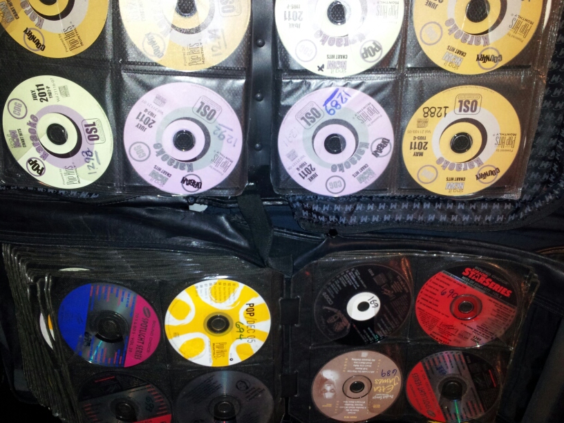 example of some disc cases....each contains over 320 cdgs, 5 seperate cases...3 english 1 spanish 1 foundations and bricks........these are just examples...inquiring minds want to know. Oh yeah as you can clearly see, all my cdg's are labeled and are sequenced in my books from DK001 to present... BTW this was taken by my cell phone tonight at my gig...fyi...although some may discredit me..... Timberlea i'msure you remember me from when you first started posting years ago, you were a newbie then, i already had alot of years on you by then......
