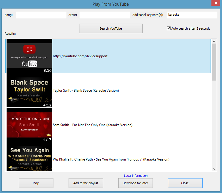 Now I know why the Siglos Karaoke player has become so popular..... It has the ability to search YouTube for karaoke videos and display them directly to the singer display without any muss or fuss. It can even download the YouTube files, convert them to MP4 and store them locally for offline playback (in a folder named "Karaoke From YouTube" no less!). No Internet connection required. So with all due respect to the folks at PowerKaraoke, creating COMMERCIAL software that includes features to enable if not encourage people to undermine the industry is just idiotic. I often say that YouTube DJ's and KJ's are the lowest of the low. Unfortunately this application helps legitimize them AND do so in a manner that even makes them look good doing it. It is completely seamless. This feature sets barrier for entry into the karaoke business to absolute zero. Mind boggling........utterly mind boggling. Attachment: