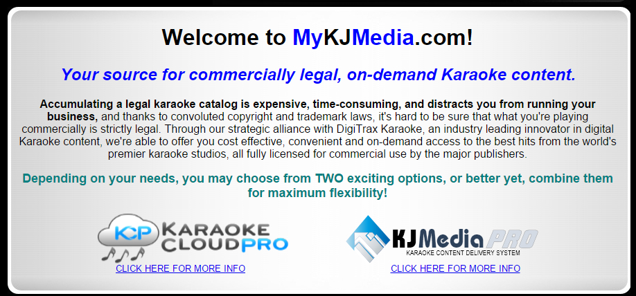 Well, that's your loss because KJMP integrates and works beautifully with CompuHost and is the best option for downloading new songs as needed without an internet connection. Maybe this is the route SC should be talking. Mr. Harrington; have you guys ever thought of jumping on the bandwagon with CompuHost like DigiTrax has? and i can buy the same songs from karaokecloud on the fly....and Tricerasoft....and Karaoke Version...and soon karaoke.net... not my preferred hosting software, nor is it Chris' so it is useless to us. a service that requires one platform is why KC pro hasn't taken off either. your book is based on the KJMP drive, when you connect to the internet to update, you also lose songs. do you go through and remove them from your book? not sure how that works, or does it automatically remove the songs from your book? What Paradigm says. and....I am not missing anything.... I already have 95% of the KJMP songs through bulk purchases of CB content. The rest can be found on demand though other producers and much sooner than KaraokeCloud delivers it. DRM is a great idea in concept, but it is not consumer (or KJ professional) friendly. It is why there was such a backlash in the music world against DRM. It's why iTunes delivers tracks without DRM. Consumers want portability. KJ's shouldn't be locked into an application because of the content.