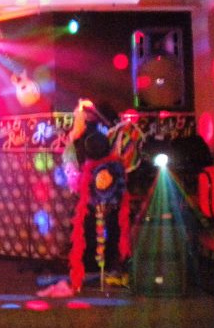The hosts where we used to live have real but unplugged intstruments as props. One is a kid's size electric guitar with the neck broken off and hanging by the one string that is left. They also have a trumpet, fiddle, keyboard and drumsticks with no drums. They play along on these instruments all night with a completely straight face which is what makes it funny. Every now and then one will jump to center stage and do a guitar solo on their knees but for the most part they stay in the background like they are just backing musicians.