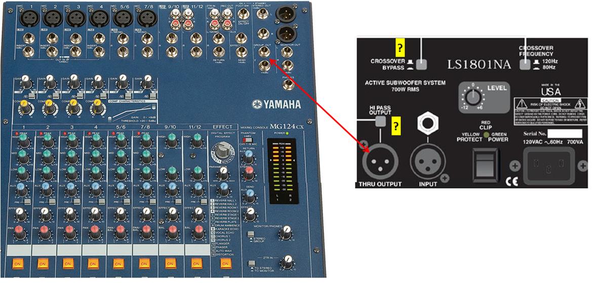 Currently I have been hooking up my stage monitor thru the aux jack (third row from the right, 2nd port down. JD are you telling me to plug m1.4" into that port or the one below? Will that work with my powered sub? That's why I didn't recommend an aux-fed sub, because I know the MG124CX only has one aux output. You can't really do both. A simple crossover is the solution, though I still think you can control the sub largely with the low EQ on your music channel. You can control that with CompuHost -- it has an EQ integrated. Plus your sound card will have one, too.
