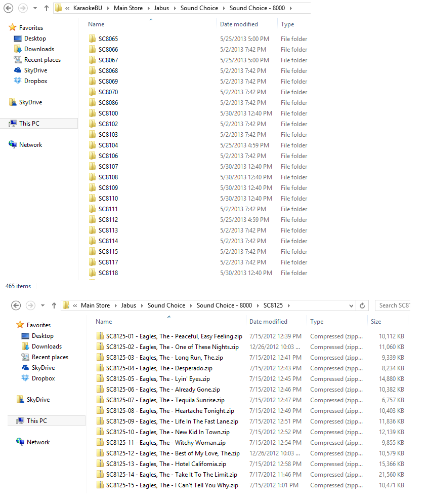 My folder structure is brand -> disk series -> disk -> files. For example: Sound Choice > SC81XX > SC8100, SC8101, SC8102, etc > Files from that disk