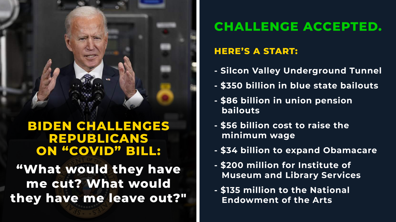 Just what part of the monies are not going towards the recovery? From what I have read the money is to go for programs directly effecting the recovery. Even the so called liberal pork barrel programs would provide jobs in infrastructure. The money is to go towards small business's, making it possible for citizens to make it through the pandemic with direct payments, fund local and state governments so they can continue to provide services, support schools so they can reopen, extend the renter's forbearance, one in 7 people don't have enough to eat this bill addresses that, extends unemployment benefits for those who still need it. Most important it funds getting as many citizens vaccinated as possible, so we can reopen. So just what money is not directly or indirectly going to shore up the economy, and deal with the pandemic? P.S. You do realize that the last election the GOP didn't even have a platform to run on? That the platform was what ever came out of Trumps mouth that second.