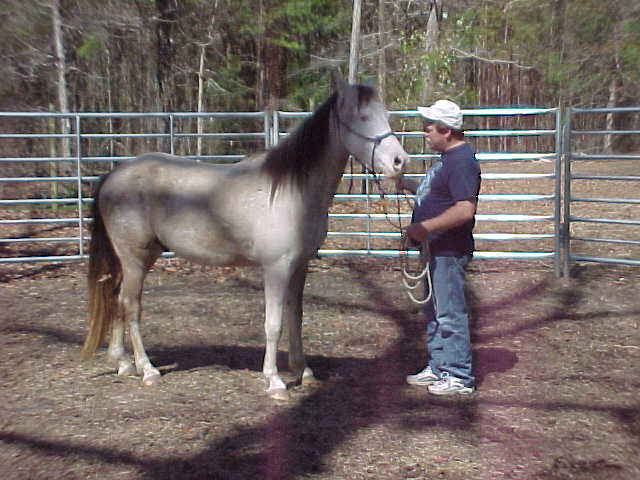 He's only 2.5 years but won't get much taller-maybe 4" or so...He's a real smooth gaited horse-gonna make a fine ladies ride someday....bobs his head and tosses his mane when he walks...picks his front feet up real high...He is going to be beautiful when he sheds his winter coat and I get him brushed out.